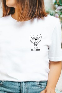 Découvrez ce t-shirt pour maman "Pieds, mains" personnalisé avec la date de naissance et le prénom de l'enfant. C'est un cadeau parfait comme cadeau pour la fête des mères.